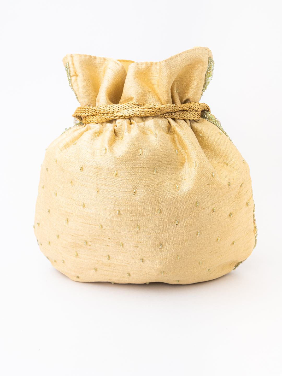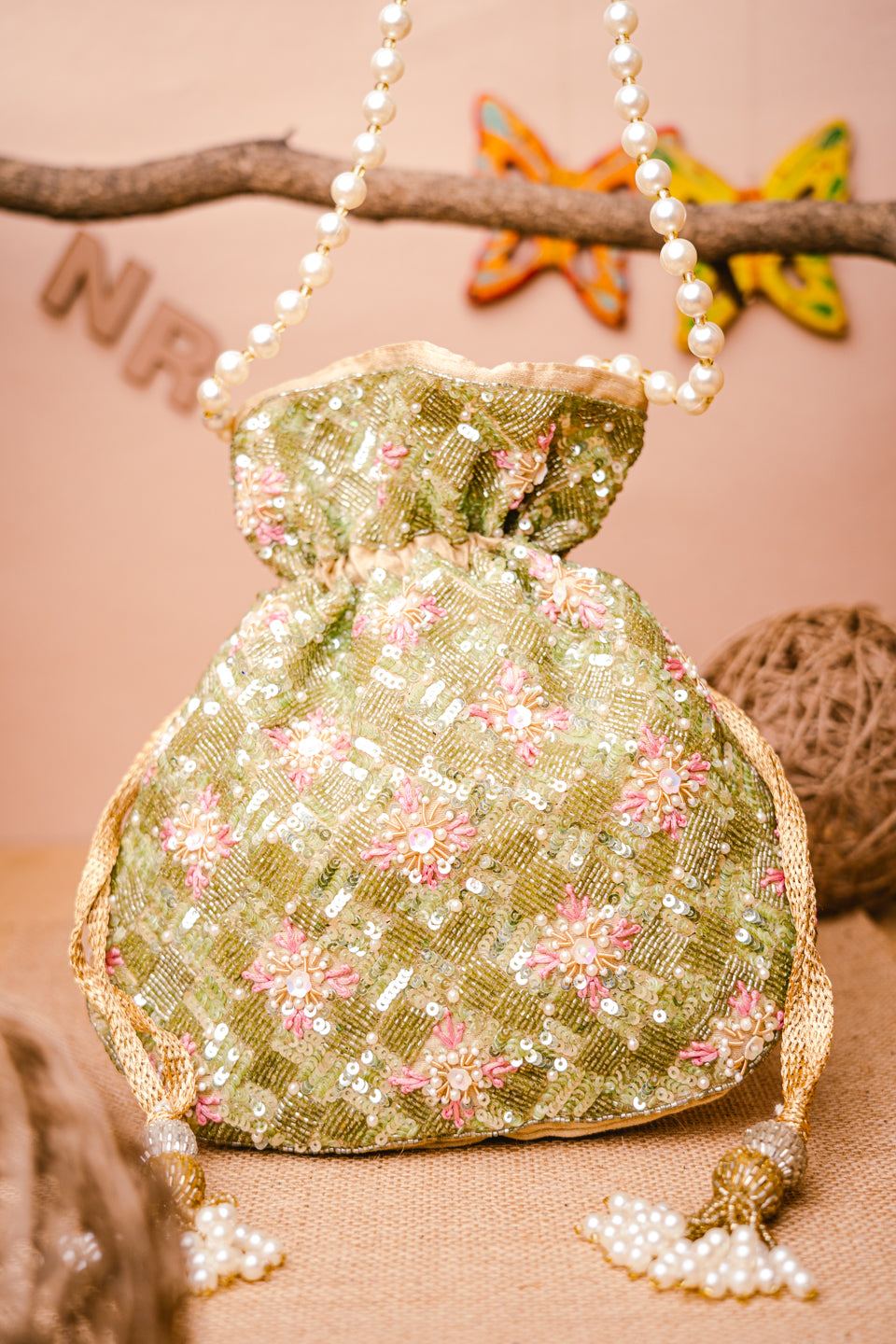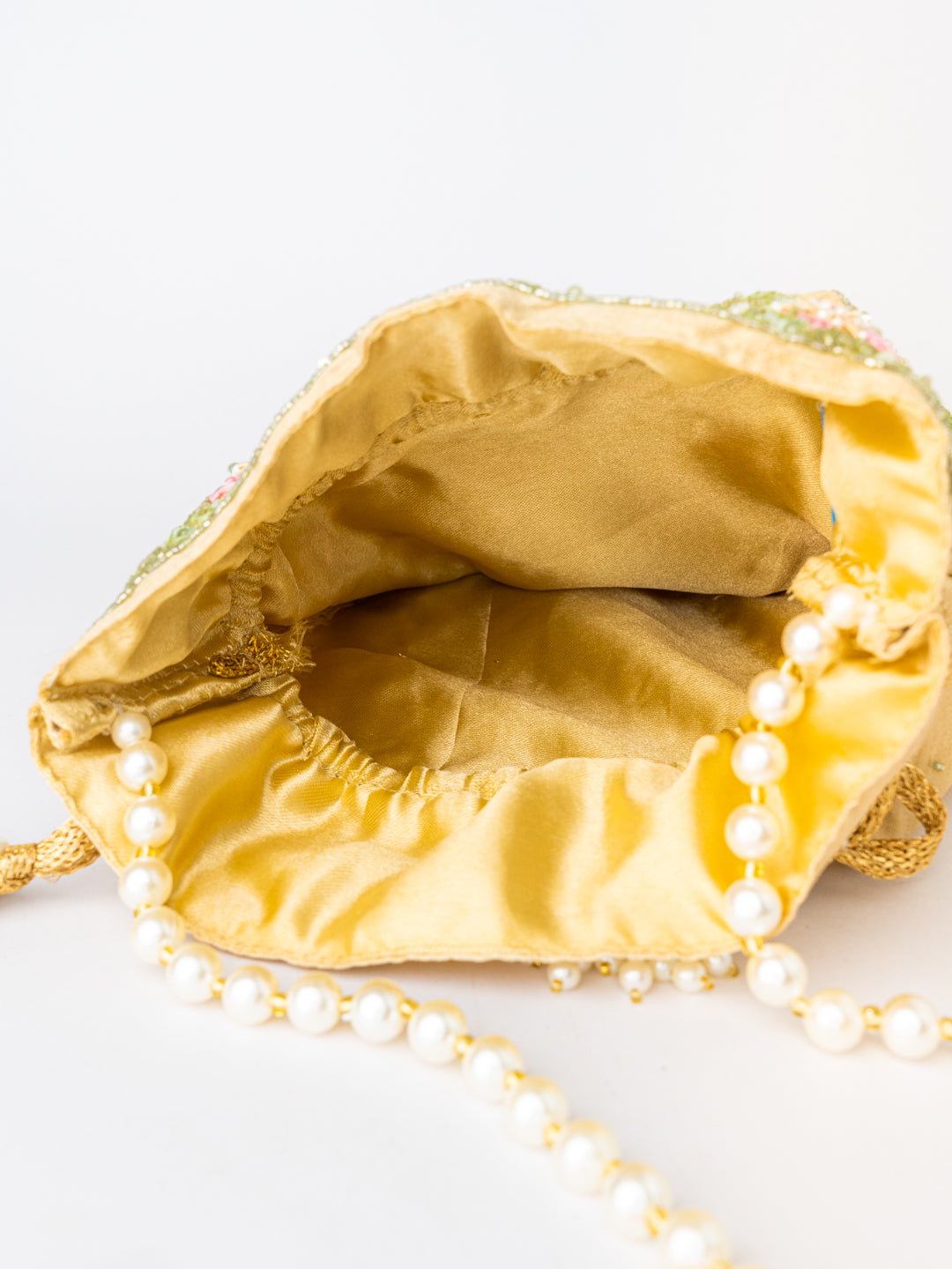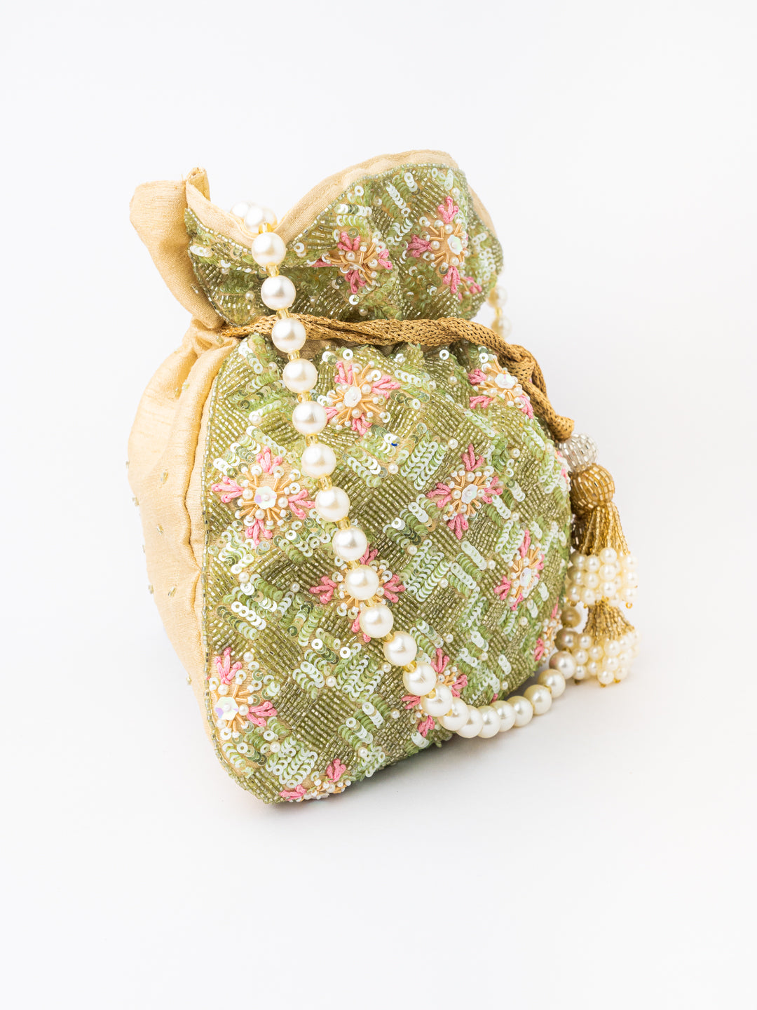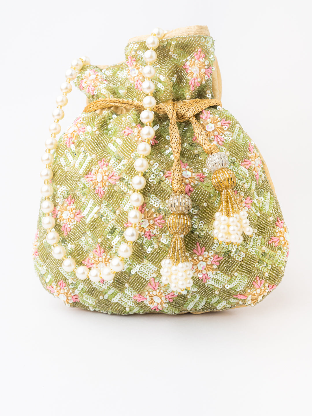 White and green embroidered potli clutches Has, shoulder strap 1 main compartment with drawstring closure