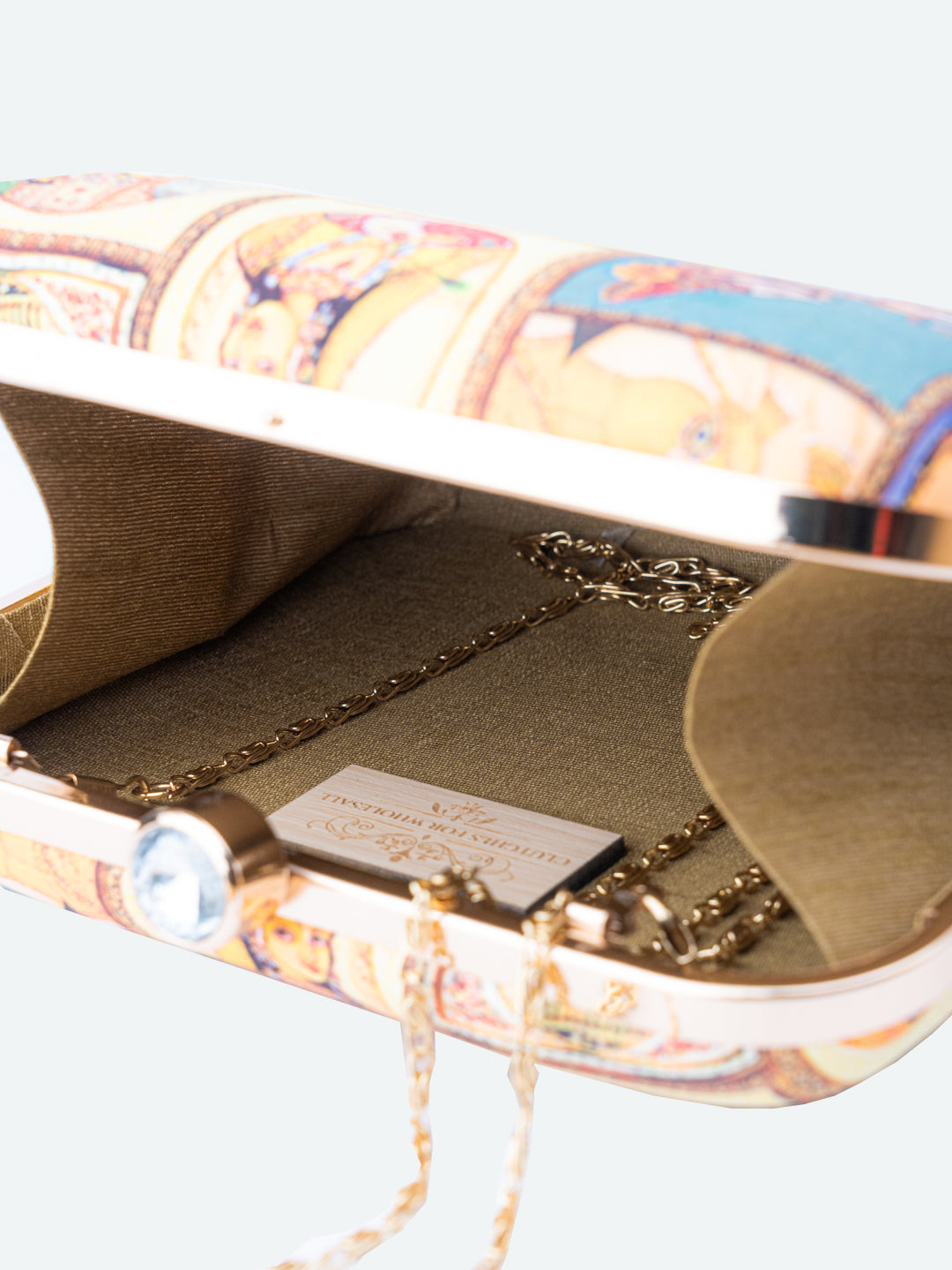 Yellow and orange printed box clutches Has, shoulder strap 1 main compartment with twist closure