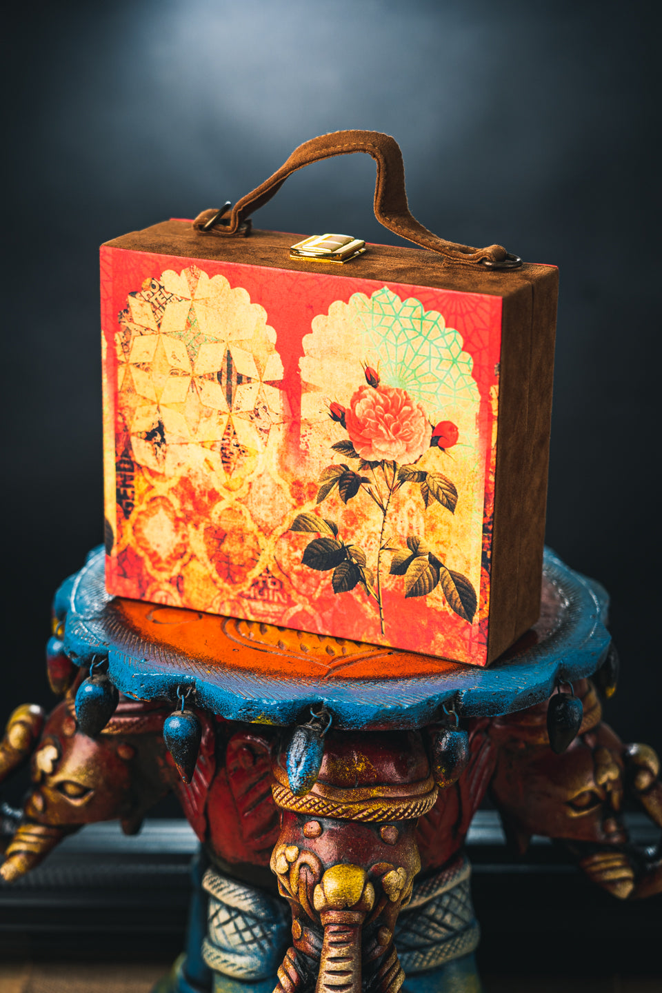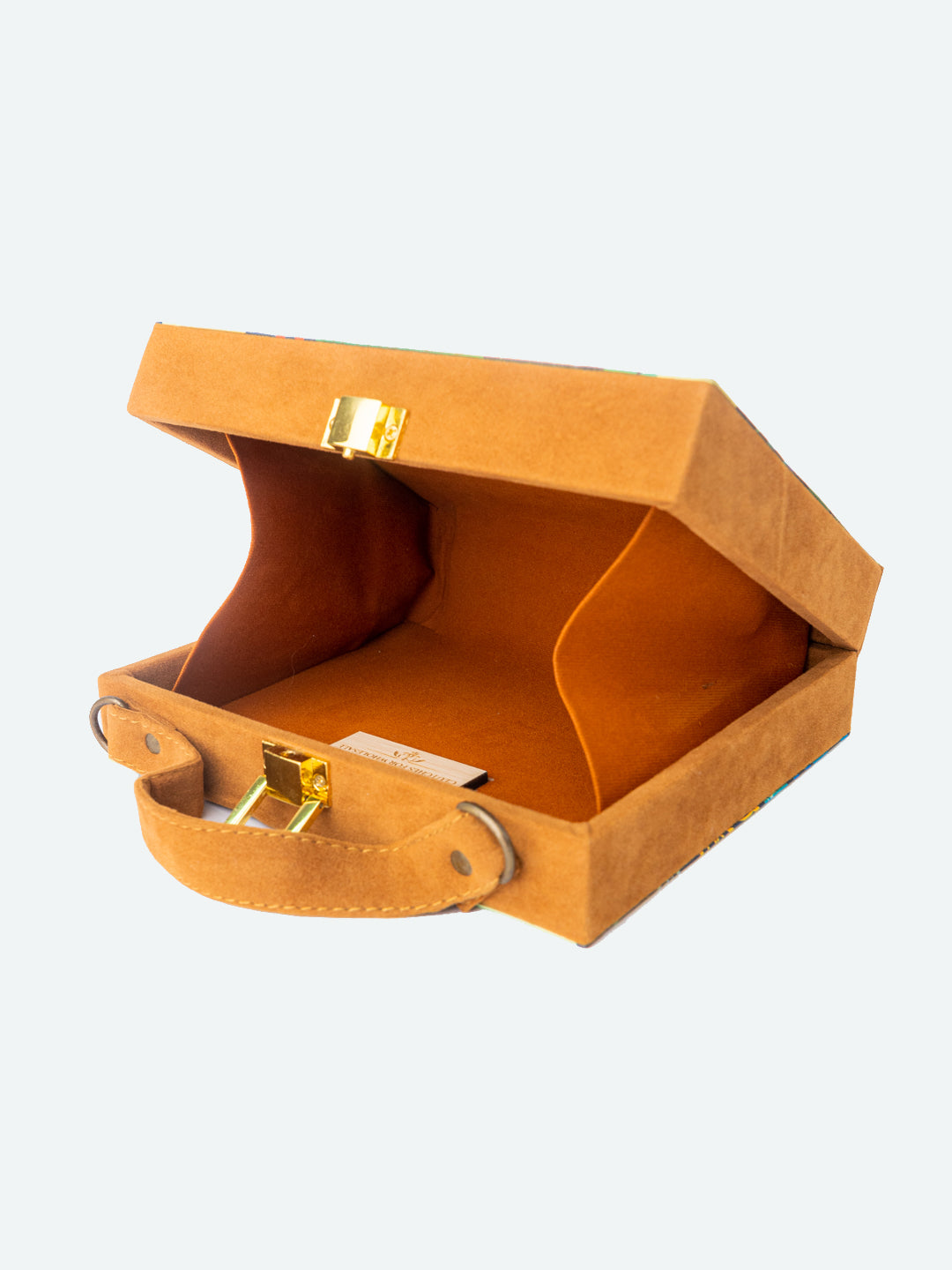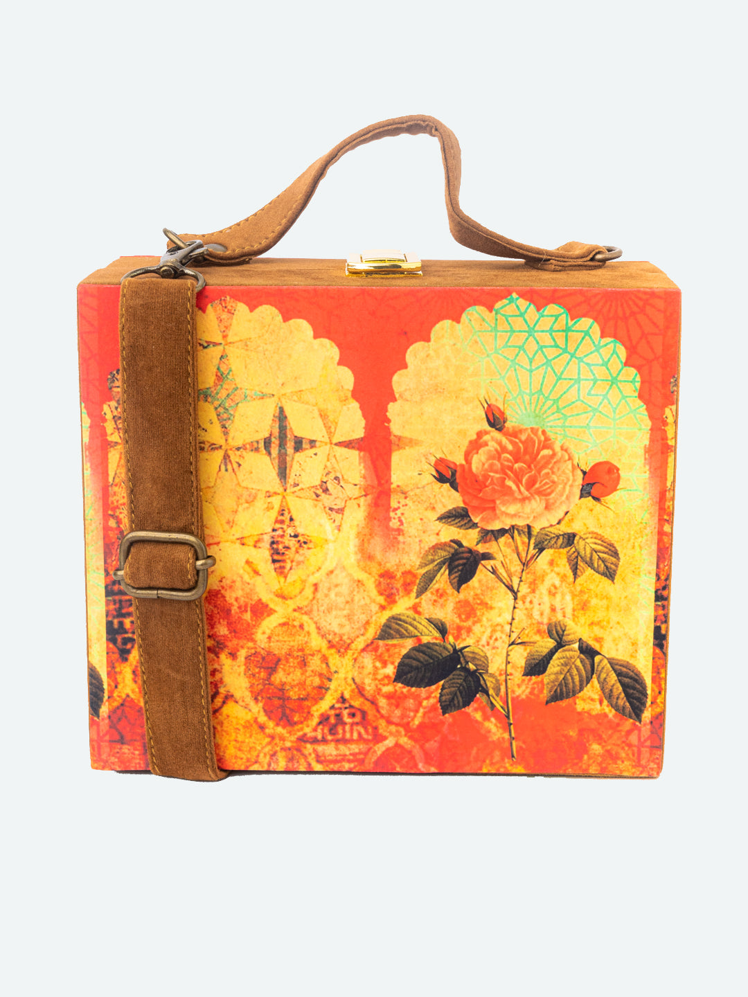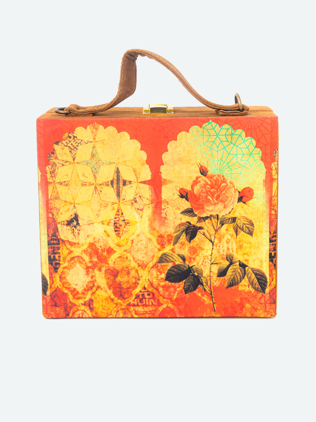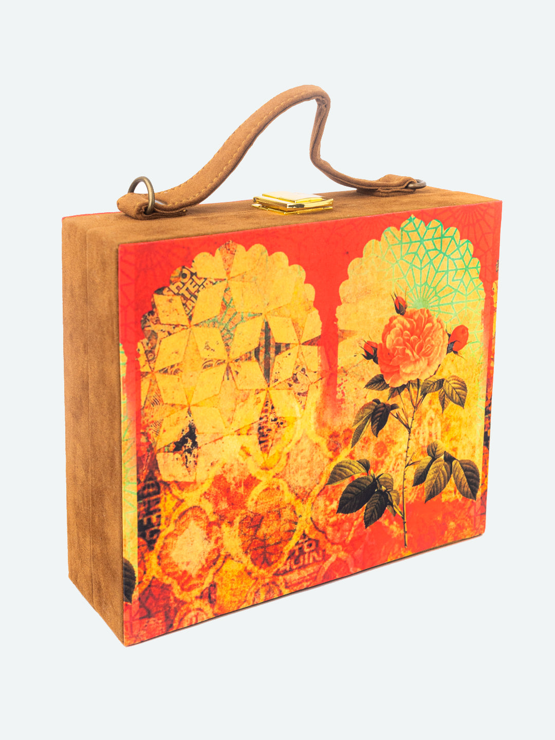 Pochette NR By Nidhi Rathi en forme de boîte imprimée orange et jaune