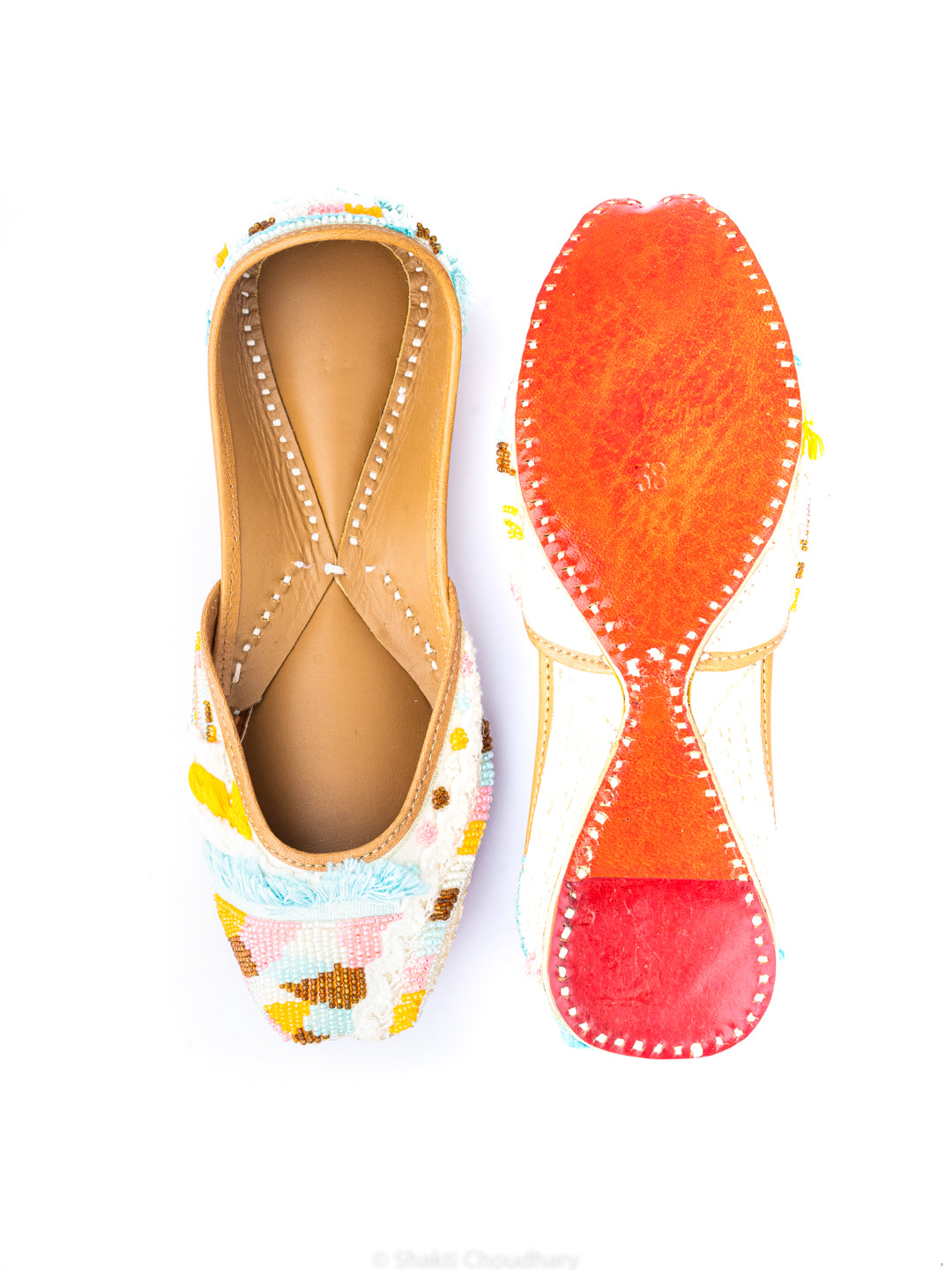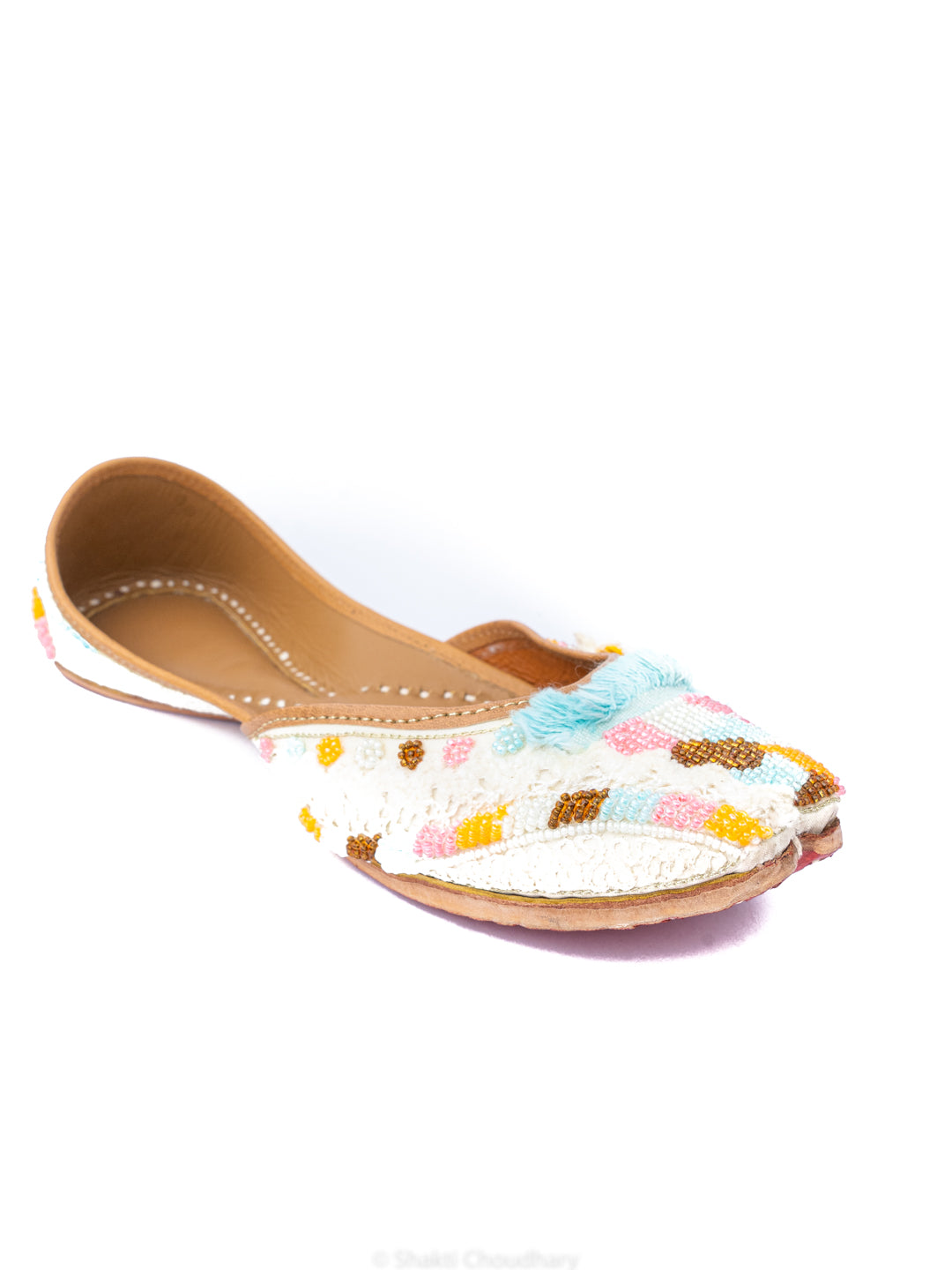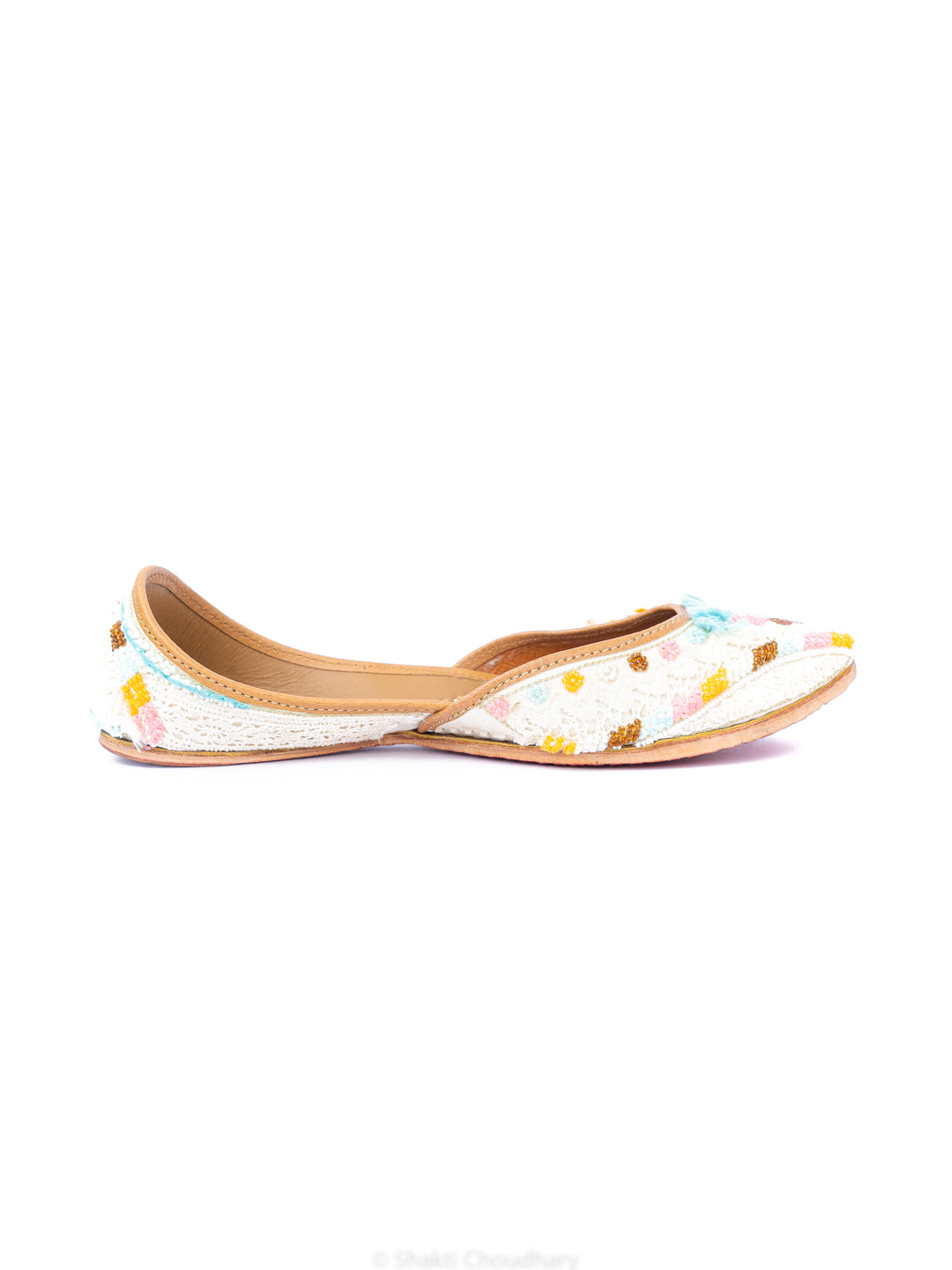 Une paire de mojaris brodées à la main blanches et roses Matériau supérieur : cuir Semelle intérieure coussinée Semelle extérieure texturée et à motifs