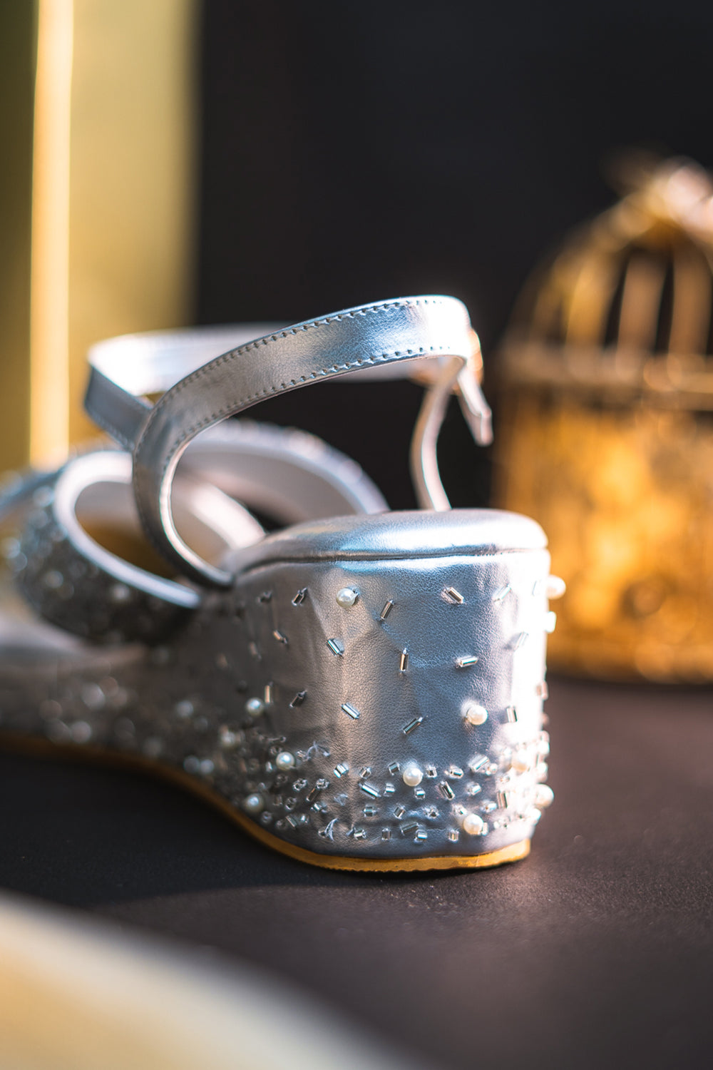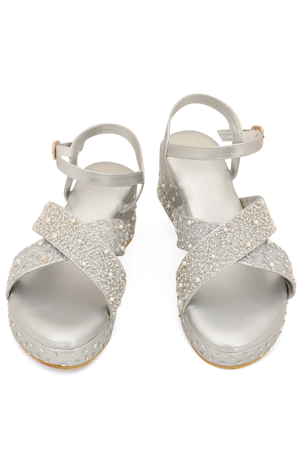 A pair of silver-toned heels ,has regular ankle and backstrap Synthetic patent embellished upper westren- embellished Cushioned footbed Textured and patterend outsole, has a wedges