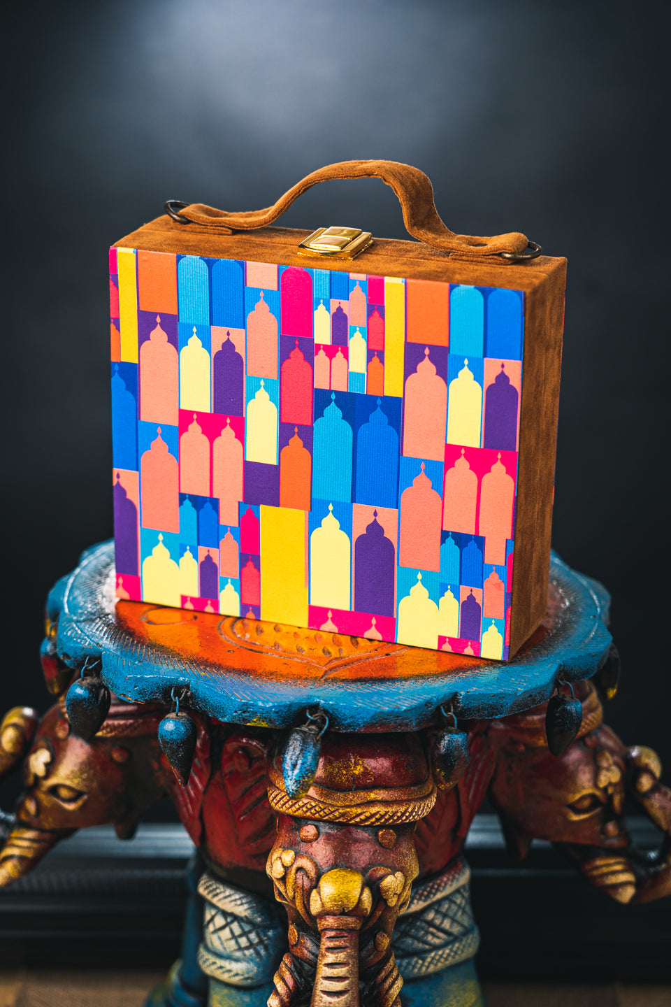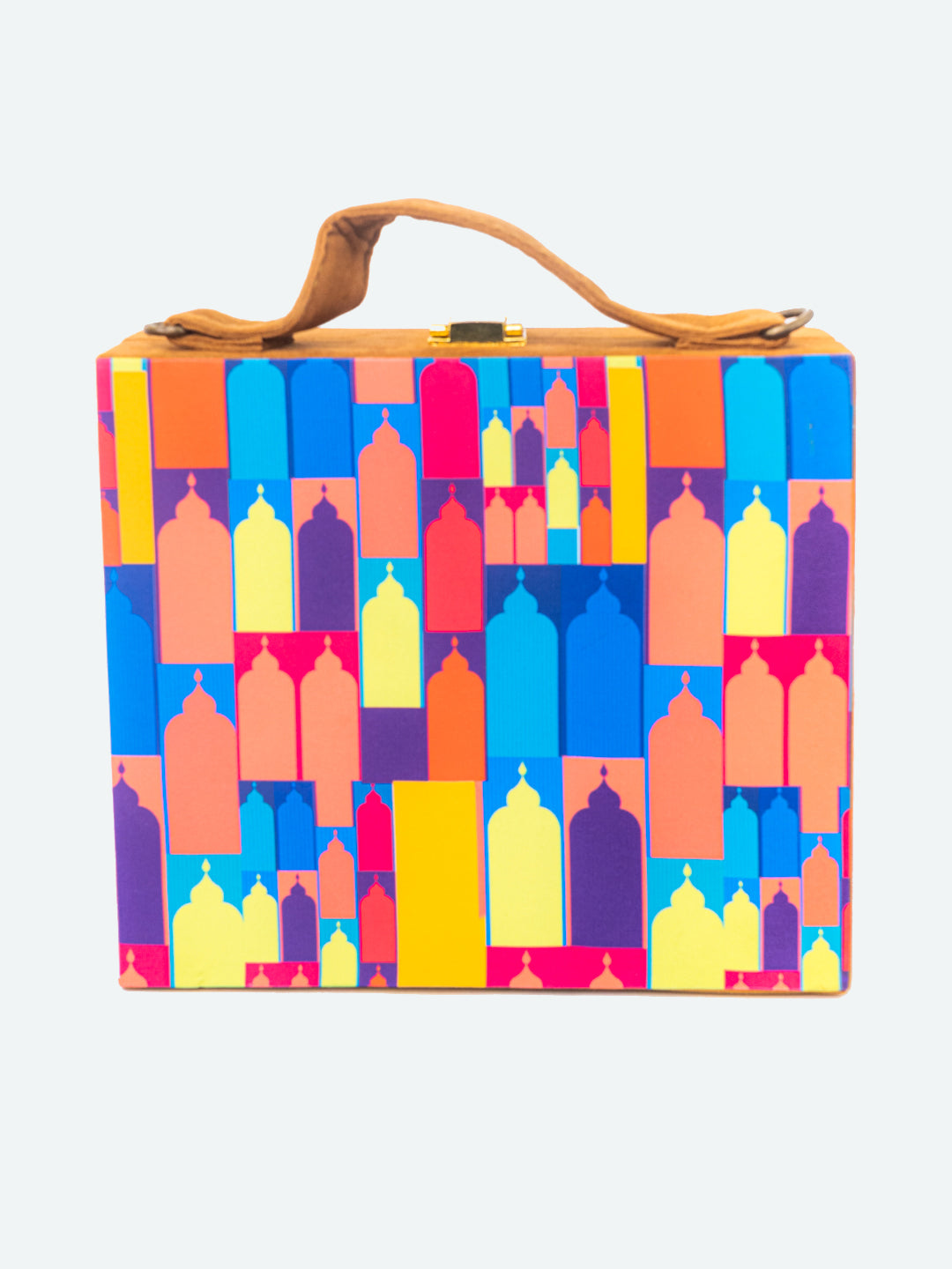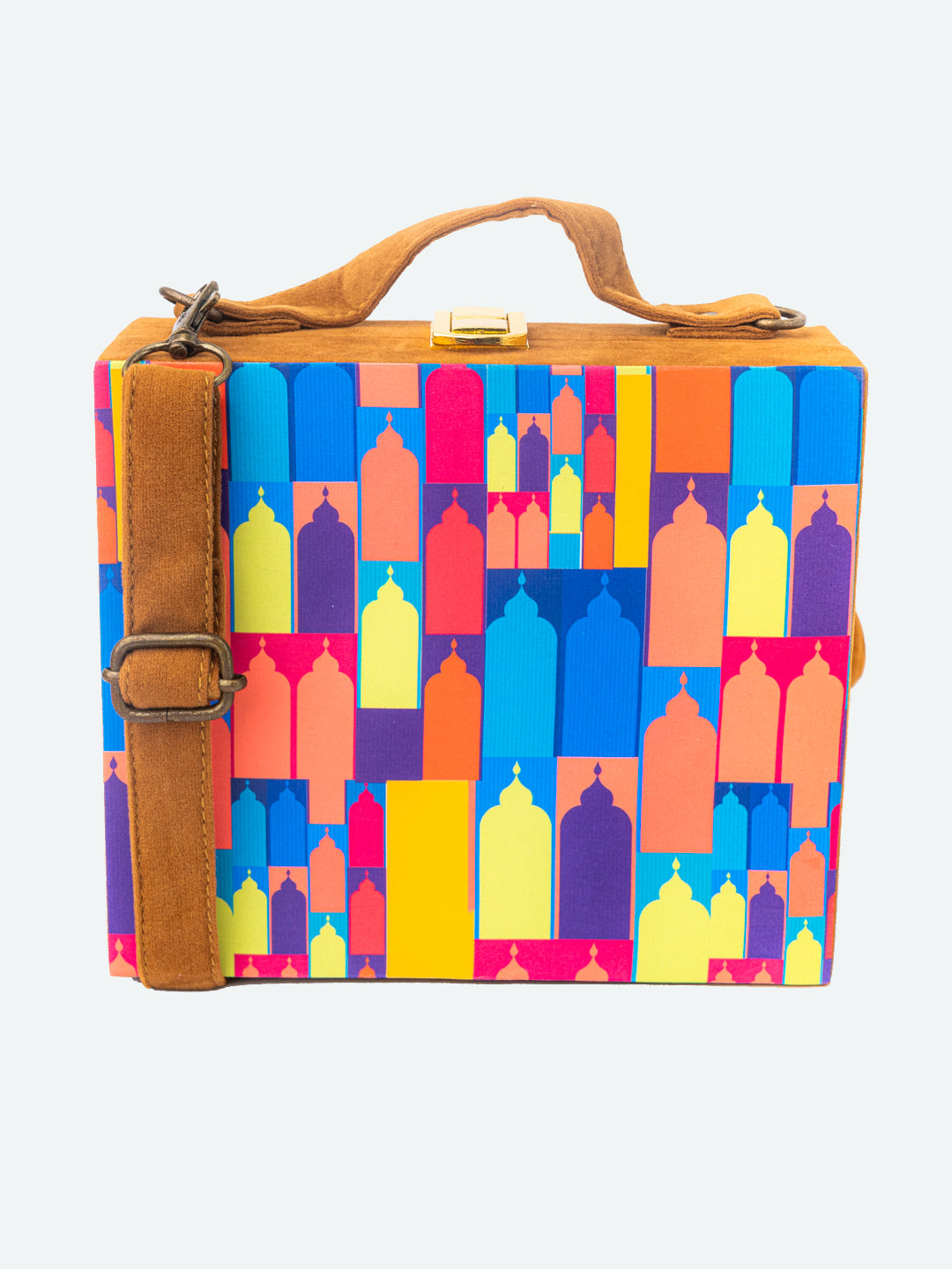 Multicolored box clutch, digital printed in matt finish on both sides, 1 main compartment with click closure, Has detachable strap