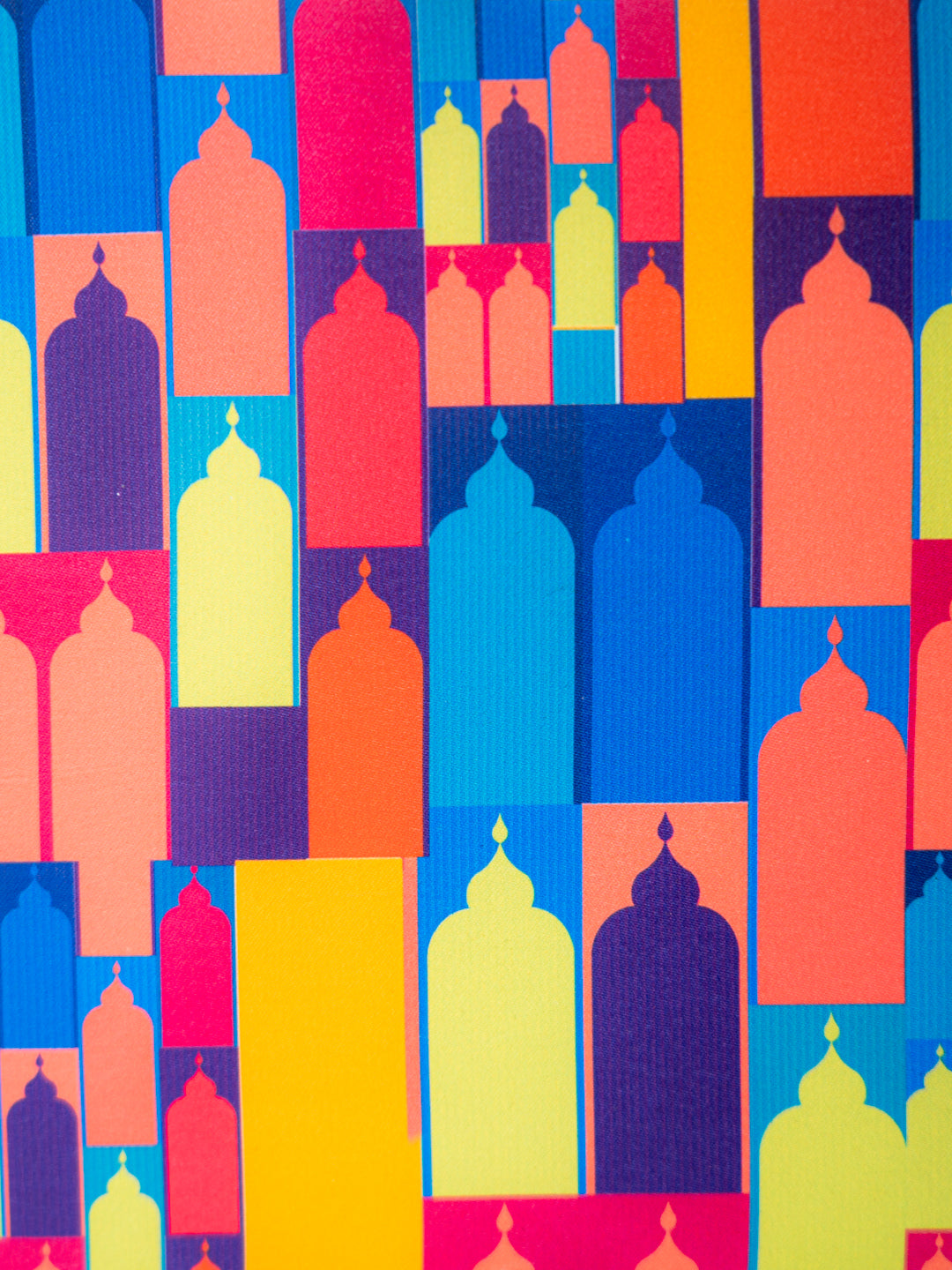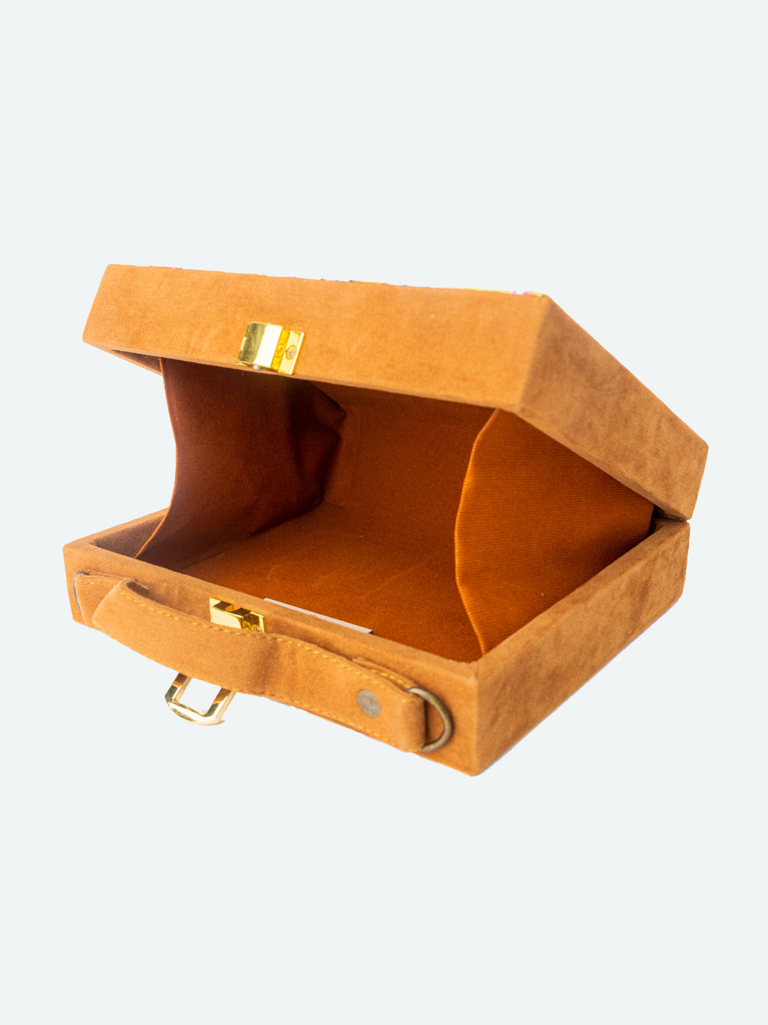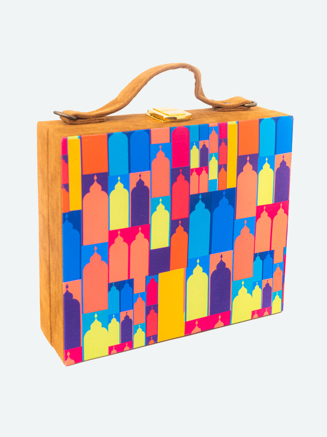 Multicolored box clutch, digital printed in matt finish on both sides, 1 main compartment with click closure, Has detachable strap